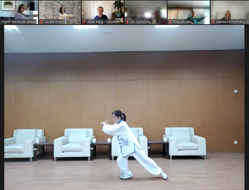 公共课教学部冯玉娟老师对中国传统健身气功八段锦进行了讲解示范。她介绍,八段锦起源于中国宋代,至今已有800多年的历史,以呼吸的调整、身体活动的调整和意识的调整为手段,以强身健体、开发潜能,体现了中国的天人合一,人和自然合一,形神合一的整体观。 随后,伴随着优美舒缓的音乐,她带领大家一起练习八段锦,动作柔和缓慢,圆活连贯,这种新颖的茶歇放松方式令大家尤其是国外参会者耳目一新,激发了大家对中国传统文化的兴趣。此外,她还为大家进行了精彩的太极拳表演,深受参会者的好评与喜爱。