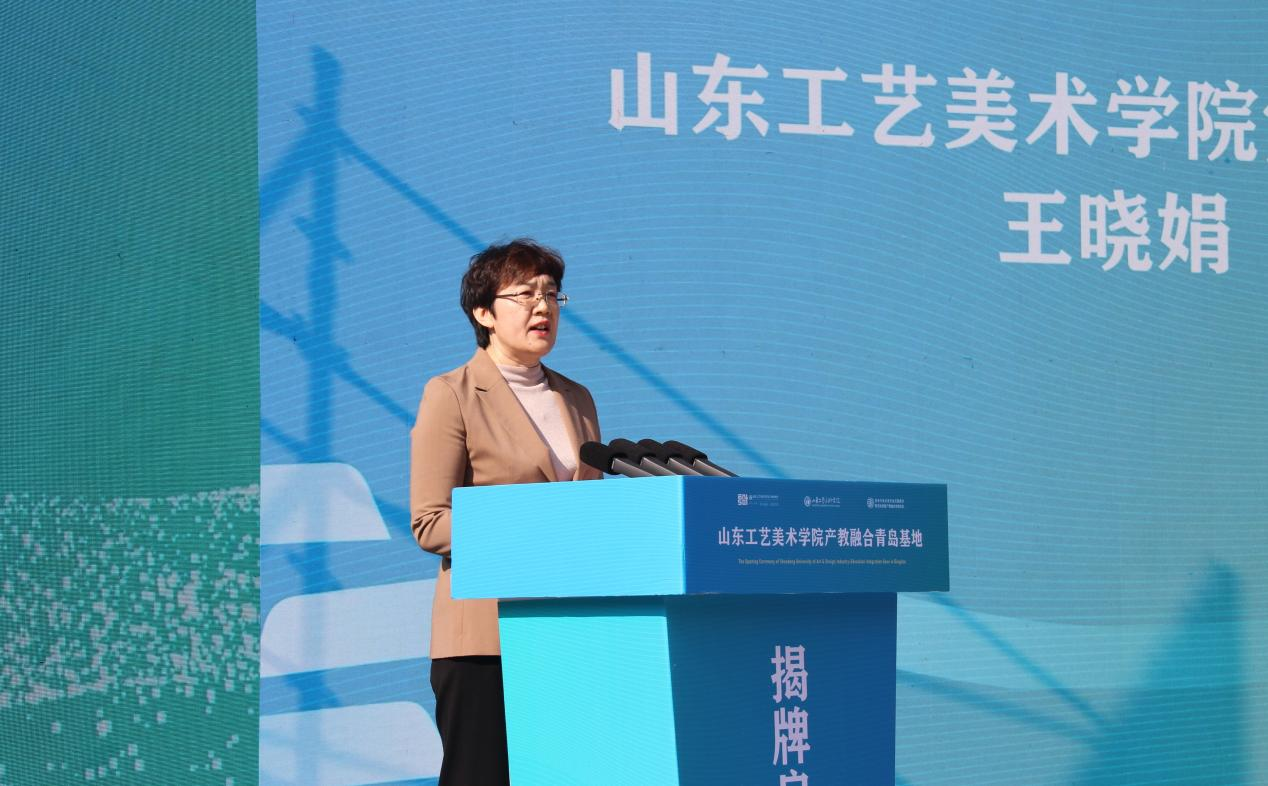 党委书记王晓娟代表学校致辞。她指出,学校产教融合青岛基地正式启用,是献给50年校庆的一份大礼,是学校发展史上一个重要的里程碑,开启了办学治校新的篇章。从1973年建校至今,山东工艺美术学院走过了五十周年的光辉历程,构建了济南、青岛、淄博“一校三地”的办学格局,逐步发展成为一所特色鲜明、优势突出、具有较高知名度和影响力的艺术与设计大学。她表示,在充满生机、活力和希望的青岛西海岸国家级新区这片沃土上,山东工艺美术学院将立足青岛产业集群优势和时尚城市定位,巩固已有办学优势,扎根沃土,开枝散叶,不断拓展办学空间和国际视野,尽快把青岛基地打造成为产教融合和对外开放的新高地、成为学校高质量内涵式发展的新引擎,更好助力青岛和西海岸新区发展,为山东教育高质量发展作出新的更大贡献!