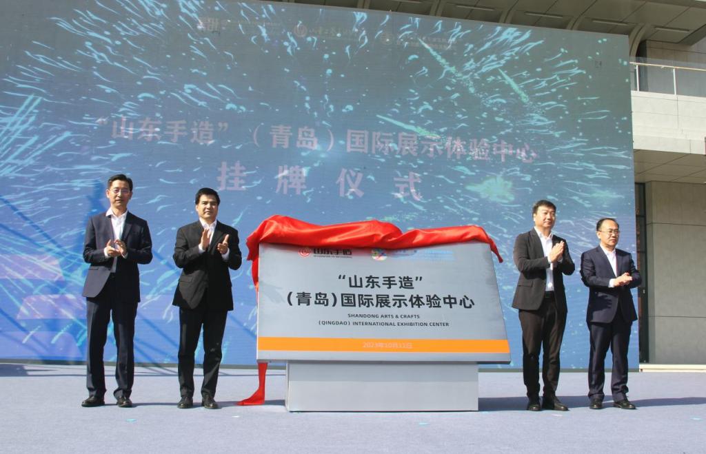 陈永庆、管学锋、董占军为“山东手造”(青岛)国际展示体验中心揭幕。