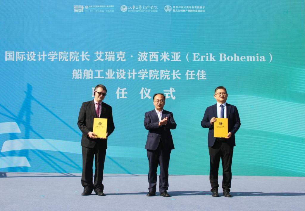 出席仪式的领导有省发改委二级巡视员王海明,省委宣传部文改办二级调研员陈建兵,中央广播电视总台山东总站党委书记、副站长陈永庆,总站党委副书记、副召集人赵飞,中央广播电视总台央广网山东分网总经理崔永刚,山东广播电视台党委委员、副台长徐龙河,新华社新闻信息中心山东中心主任赵大勇,青岛市文旅局党组书记、局长,青岛海发国有资本投资运营集团有限公司总经理管学锋,中国文联副主席、中国民间文艺家协会主席、山东工艺美术学院名誉院长潘鲁生,云冈研究院党委书记张焯,国际设计素养联盟主席、国际设计创新管理学会主席、教授艾瑞克·波西米亚,欧洲设计中心中国区代表钟蓝,智利发展大学教授乌苏拉·布莱沃,中国高教学会设计教育专委会常务副理事长兼秘书长、中国学位与研究生教育学会艺术专业学位工作委员会副主任、教授何洁,中国工业设计学会特邀副会长兼设计研究委员会主任委员、中国美协工业设计艺委会副主任、江苏省工业设计学会理事长、教授何晓佑,中国高教学会设计教育专委会副理事长、中国室内装饰协会副会长、中国美协平面设计艺委会副主任、教授赵健,国际公共艺术协会副主席、上海市文联副主席、教授汪大伟,中国美术学院副院长、教授韩绪,中央美术学院教务处处长、教授郝凝辉,鲁迅美术学院院长助理、教授王子源,清华青岛艺术与科学创新研究院执行副院长、教授汪建松,上海大学美术学院执行院长、上海市文联副主席、教授金江波,济宁职业技术学院党委书记高广立,黄海学院党委书记邢桂强,山东演艺集团有限责任公司党委书记、董事长于剑,青岛出版集团有限公司党委委员、董事李茗茗,青岛市建筑设计研究院集团股份有限公司董事、总经理陆涛,中国电影美术学会副会长全荣哲,山东省电影家协会会长李九红;山东工艺美术学院党委书记王晓娟,院长董占军,党委副书记韩世春,副院长张艳霞,副院长韩文涛,纪委书记谷朝勇,党委委员、组织部部长许磊,党委委员、宣传部部长孙磊,党委委员、统战部部长安峰。仪式由韩文涛主持。